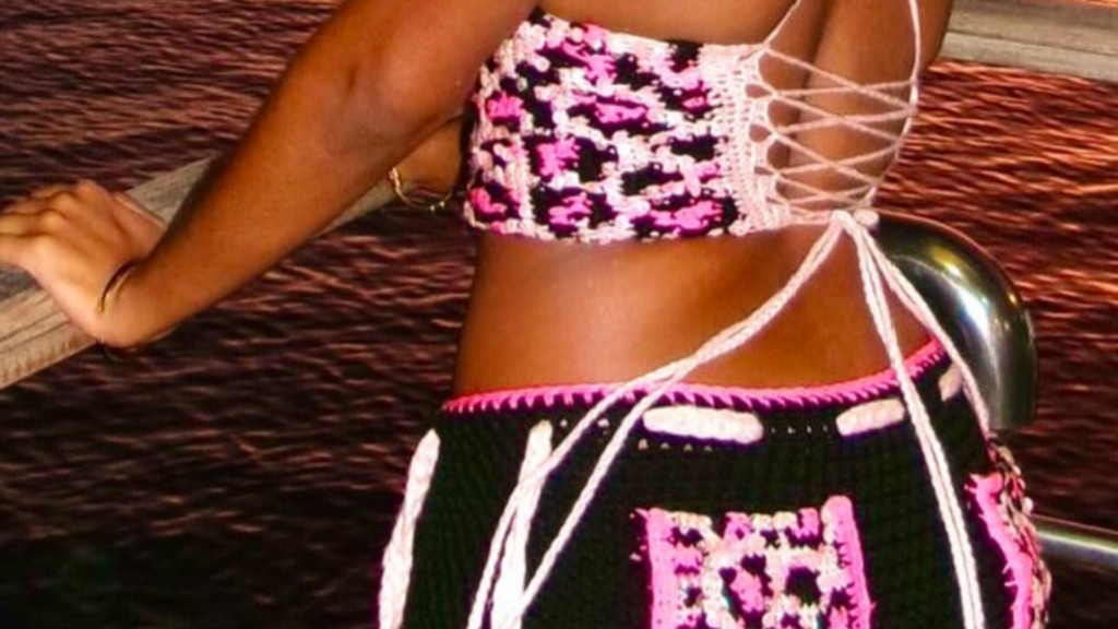 “I made holey bags until I got a phone and access to the internet, ” she recalled. “That happened at 14. I used to go on Youtube and look for tutorials on how to actually do things with more complex stitches, that my mom didn’t teach. The first thing I tried to make was a bikini top…when I realised that you can crochet a swimsuit. It did not fit because I didn’t think much about sizing, I was just excited.”